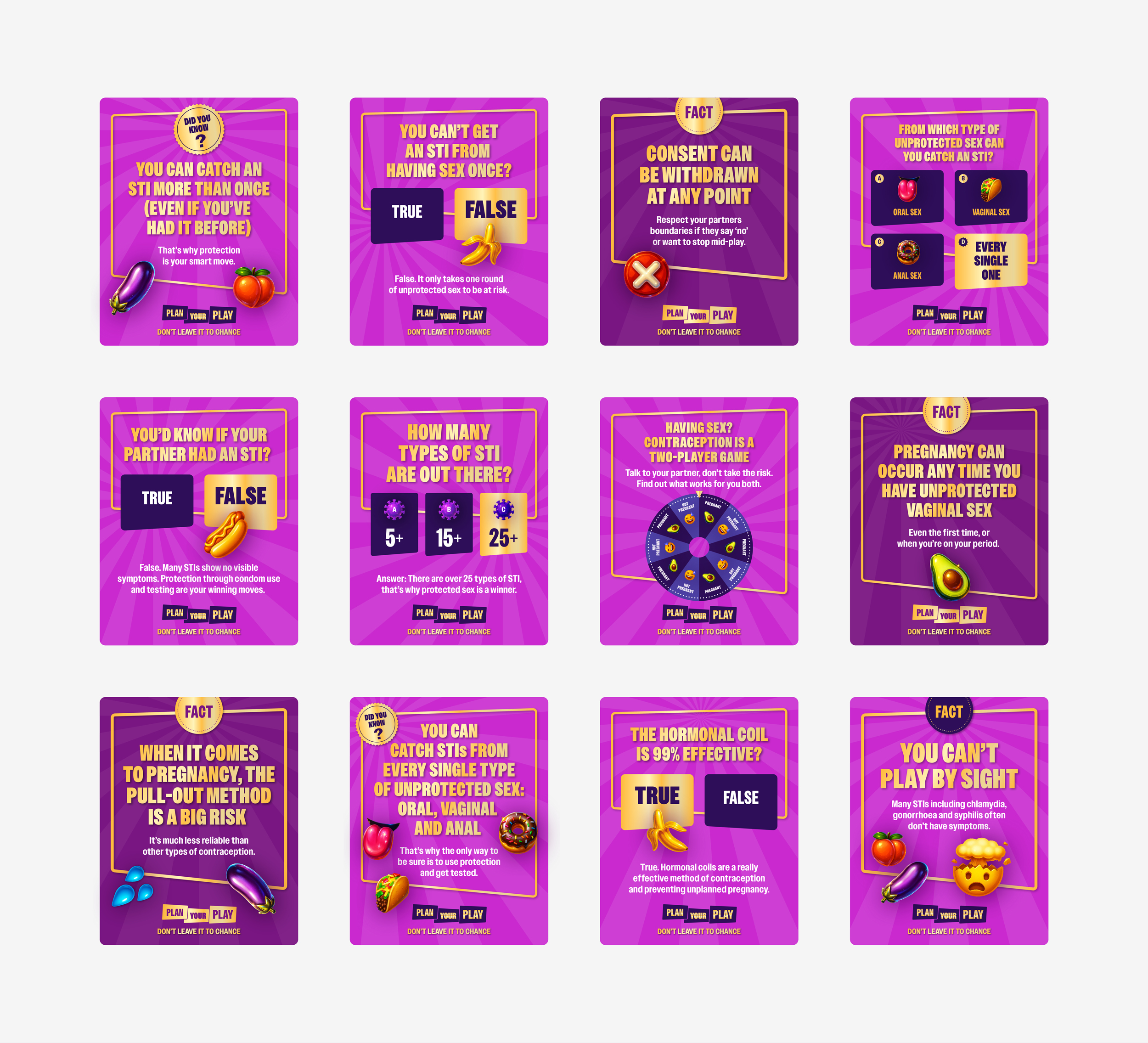 Although addressing an extremely serious issue, it was important to adopt a graphic language that didn’t appear ‘preachy’ or condescending, as we know this works against public health engagement and any genuine behaviour change. This balance was achieved with the introduction of a number of emojis with (hidden) sexual connotations that were coupled with a visual approach that mimicked traditional quiz formats, such as; true or false, multiple choice, or word searches, linking in with the idea of ‘play’ but also allowing us to present the facts. This unusual but interesting juxtaposition allowed us to generate assets that were both informative and engaging while reinforcing the notion that decisions around good sexual behaviour should not be left to chance, and that everyone should play their part in contraception, protection, testing and respect when it comes to sexual health.