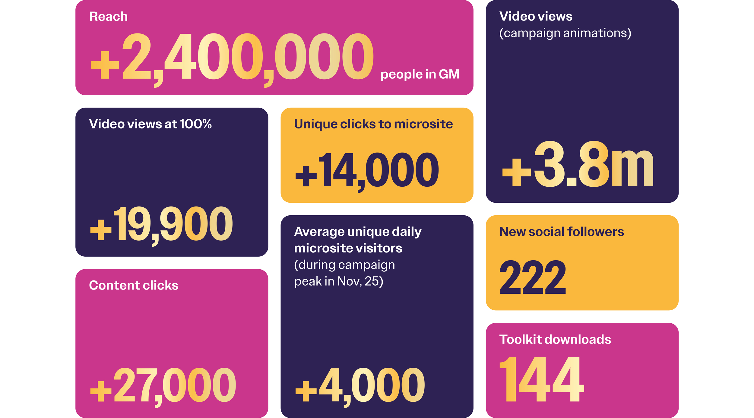 The results show impressive reach, views, clicks and campaign engagement from the target audience, given a tight media budget. Across a ten-week ‘live’ period, the campaign achieved the following results: